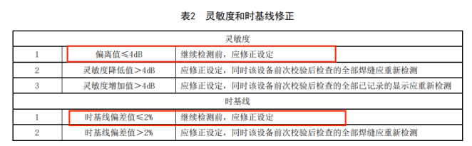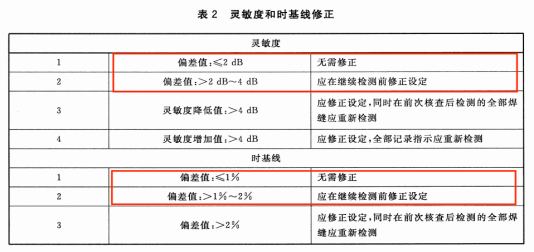 | 11 | 10 時基線和靈敏度設定 10.1 概述 依據本標準和附錄E要求,每次檢測前應設定時基線和靈敏度,并考慮溫度的影響。時基線和靈敏度設定時的溫度與焊縫檢測時的溫度之差不應超過15℃。檢測過程中至少每4小時或檢測結束時,應對時基線和靈敏度設定進行校驗。當系統參數發生變化或等同設定變化受到質疑時,也應重新校驗。如果在檢測過程中發現偏離,應按表2要求進行修正。 ![]() | 11 時基線和靈敏度設定 11.1 總體要求 按照本文件和ISO16811的規定,每次檢測前應設定時基線和靈敏度,并考慮溫度的影響。時基線和靈敏度設定時的溫度與焊縫檢測時的溫度之差不應超過15℃。 檢測中至少每4h或檢測結束時,應核查時基線和靈敏度設定。當系統參數發生變化或等同設定變化受到質疑時,也應重新核查時基線和靈敏度設定。 如果在核查過程中發現靈敏度偏差值大于2dB或時基線偏差值大于1%,應按表2進行修正。 ![]() | 更改了靈敏度和時基線修正要求(見表2,2013年版的表2) |