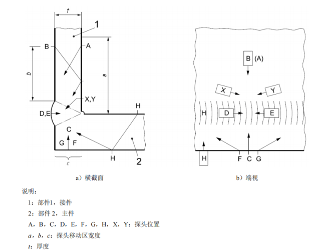 | 10 | 8?探頭移動區 探頭移動區應足夠寬,以保證聲束能覆蓋整個檢測區域(見圖2)。增加探測面,比如在焊接接頭雙面進行掃查,可縮短探頭移動區寬度。探頭移動區表面應平滑,無焊接飛濺、鐵屑、油垢及其他外部雜質。探頭移動區表面的不平整度,不應引起探頭和工件的接觸間隙超過0.5mm。如果間隙超標,應修整探頭移動區表面。當焊縫表面局部變形導致探頭與焊縫的間隙大于1mm,可在受影響位置用其他角度探頭進行補充掃查。如果該掃查能彌補未掃查到的檢測區域,此局部變形是允許的。探頭移動區和聲束反射面應允許無干擾的耦合劑和反射物。 | 9?掃查面準備 掃查面應足夠寬,以確保聲束覆蓋整個檢測區域(見圖2)。或者,如果能實現焊接接頭雙面掃查以確保聲束覆蓋整個檢測區域,可縮短掃查面寬度。掃查面表面應平滑,無焊接飛濺、鐵屑、油垢及其他外部雜質。掃查面表面的不平整度,不應引起探頭和檢測表面的間隙大于0.5mm。如果間隙超標,應修整掃查面表面。當遇到表面局部變化,如沿著焊趾掃查,導致探頭與表面的間隙大于1mm時,僅當在受影響部位增加至少一個其他角度的探頭進行補充掃查時才能被允許。該補充掃查應解決因間隙超標引起聲束未覆蓋整個檢測區域的問題。掃查面和聲束反射面應允許無于擾的耦合劑和反射物。 | 更改了掃查面準備要求(見第9章,2013年版的第8章) |